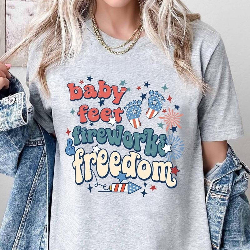 4th of July Maternity Shirt Baby Feet Fireworks and Freedom Pregnancy Reveal Tee Patriotic Mom To Be 100% Cotton