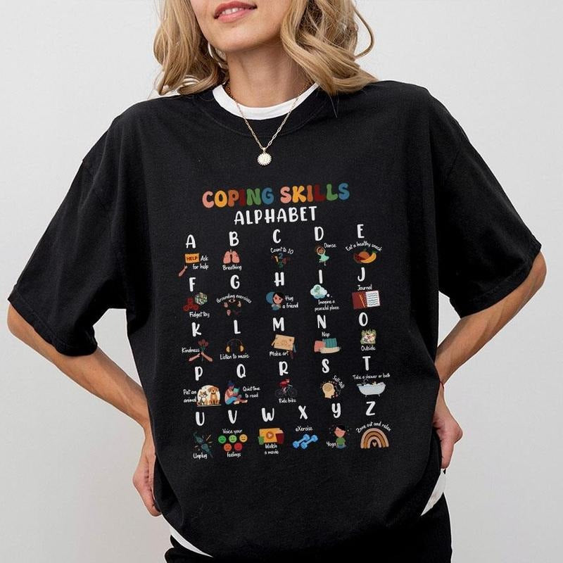 ABC Coping Skills, Coping Skill Alphabet Shirt, School Counselor Shirt, Back to School Gifts, Psychologist Shirt, School Psychologist Shirt, Gift for Teacher Tshirt, Alphabet Exercises Shirt, Comfort Shirt for Teacher, Sped Teacher TShirt, Women Top