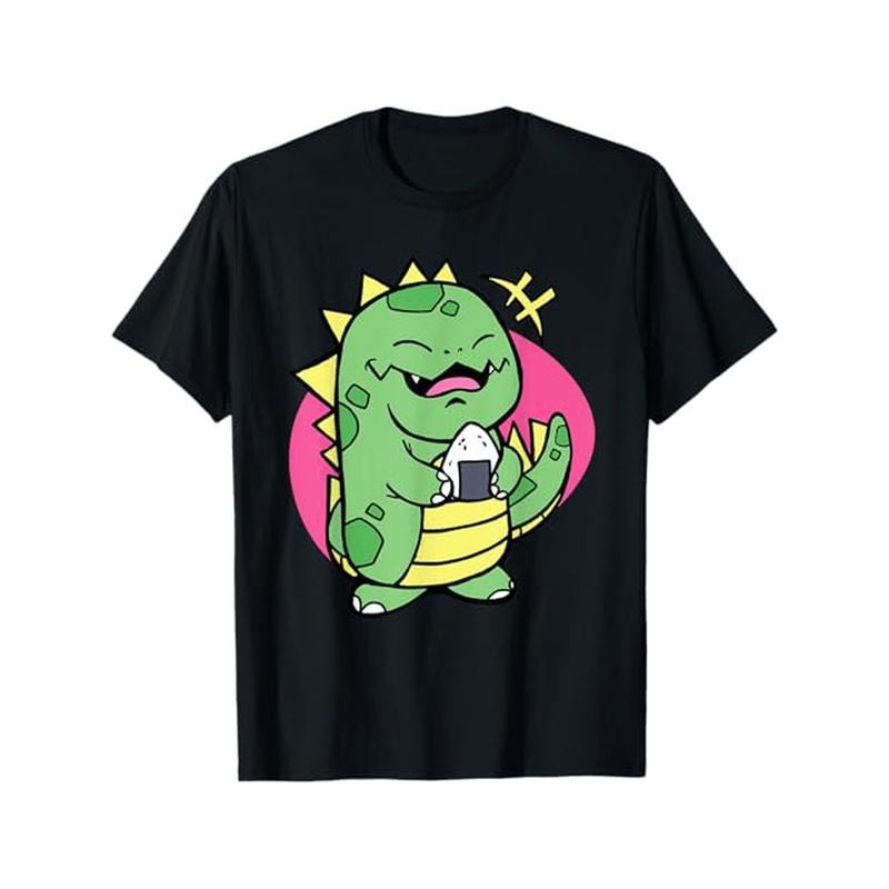Adult Casual 100% Cotton T-Shirt with Dinosaur & Onigiri Graphic, Crew Neck, Short Sleeve, Slight Stretch, Pullover Style, Hot Stamped, All-Season Wear, Regular Fit - Black Made in USA