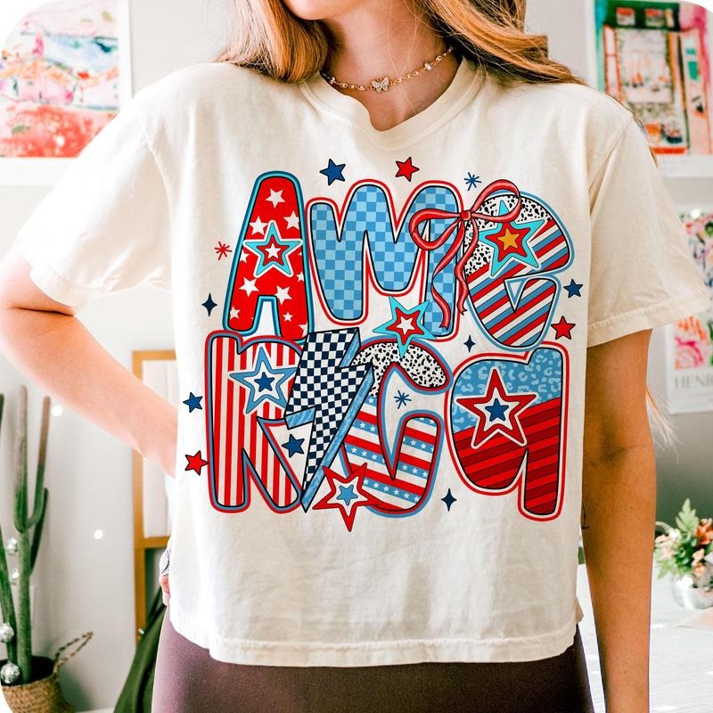 America Retro Checkered Shirt 4th of July Patriotic Coquette USA Star Bow Graphic Unisex Crewneck
