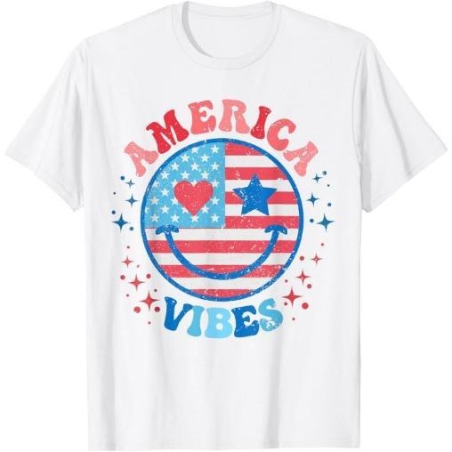 America Vibes Smile Face American Flag 4th Of July Groovy T-Shirt Made in USA