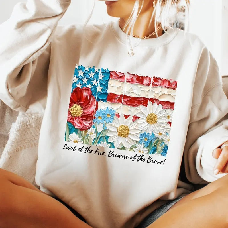 American Flag Sweatshirt, 4th of July Memorial Shirt, Floral America USA, Patriotic, Girly USA Shirt