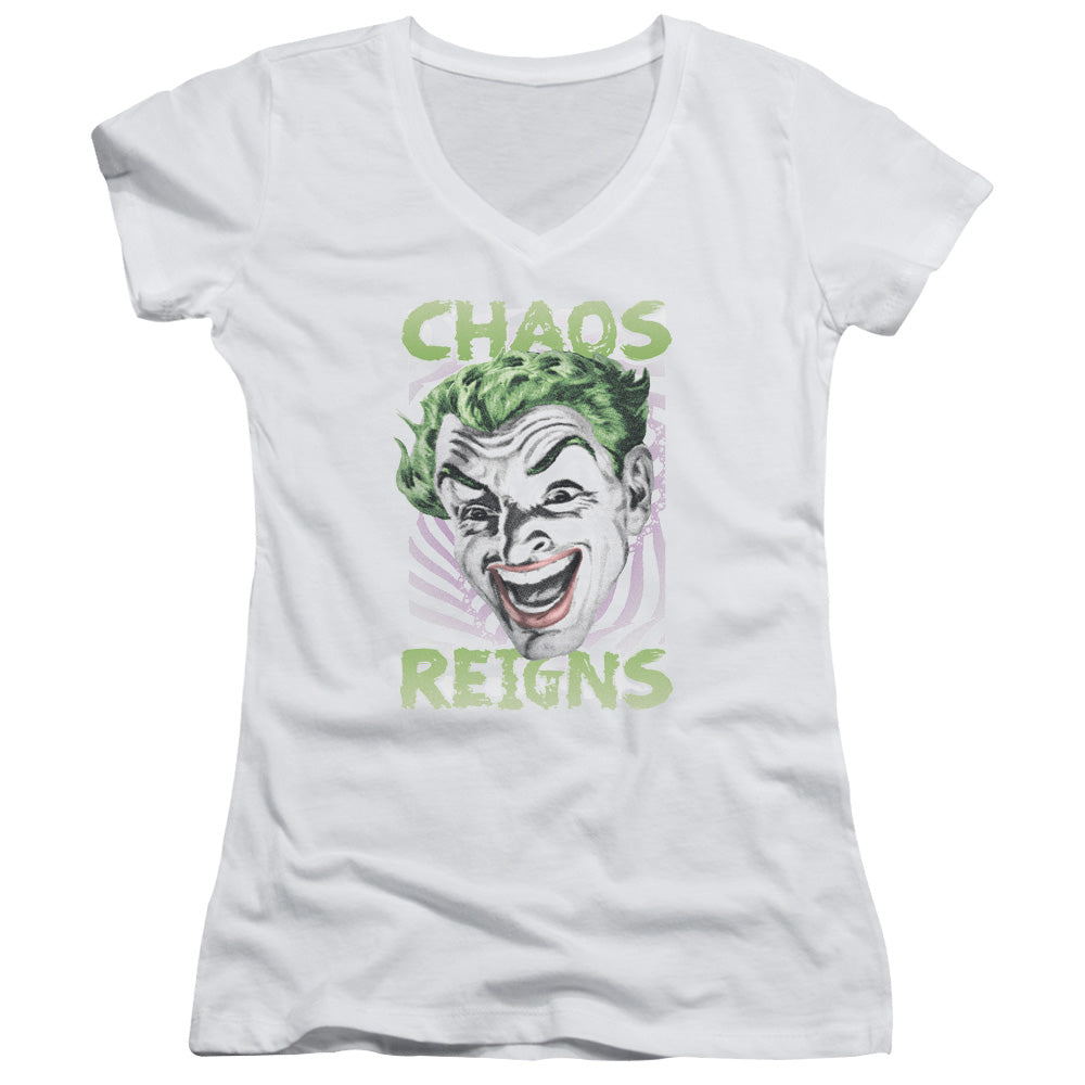 Batman Classic Tv Chaos Reigns Junior Sheer Cap Sleeve V Neck Womens T Shirt White