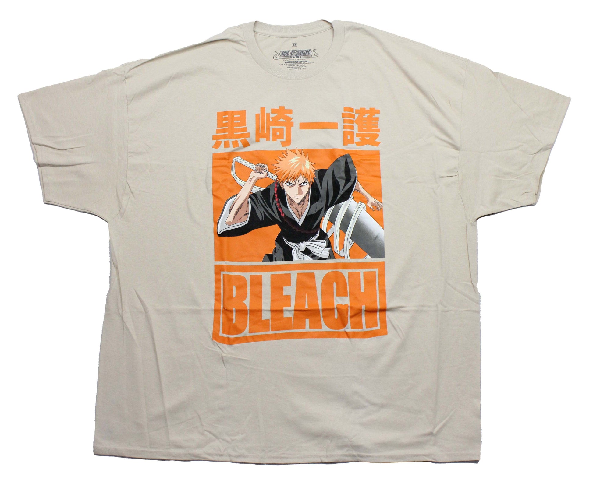 Bleach Mens T-Shirt - Ichigo Grabbing Sword Orange Background Kanji Name
