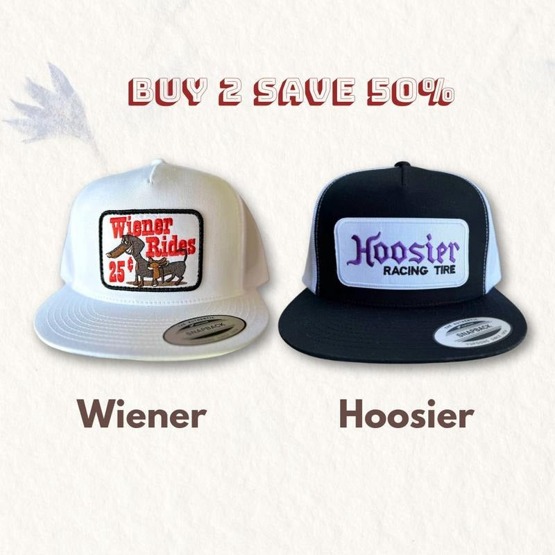 [BUY 2 SAVE 50%] Set 2 Hat Retro Hoosier Racing Tire Patch Trucker Hat Classic Black/White, Wiener Rides Patch Trucker Hat, Adult Size
