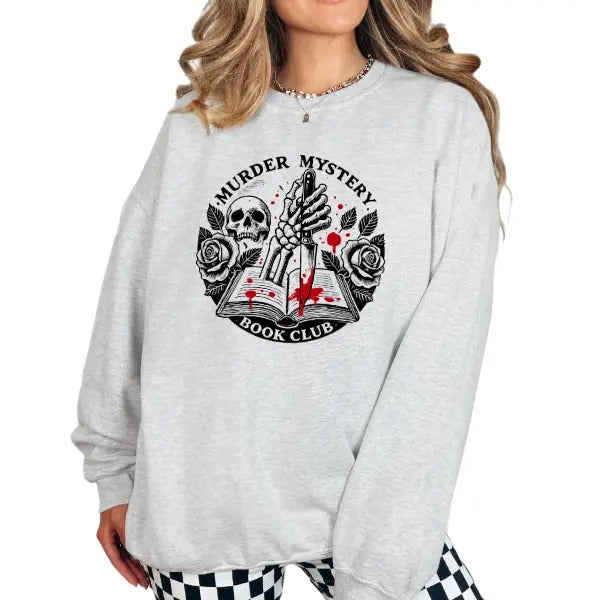 Casual True Crime Book Club Crewneck Sweatshirt, Hoodie & TShirt, Skeleton Graphic Pullover Sweater, Cotton, Womenswear, Long Sleeves Comfort Fit