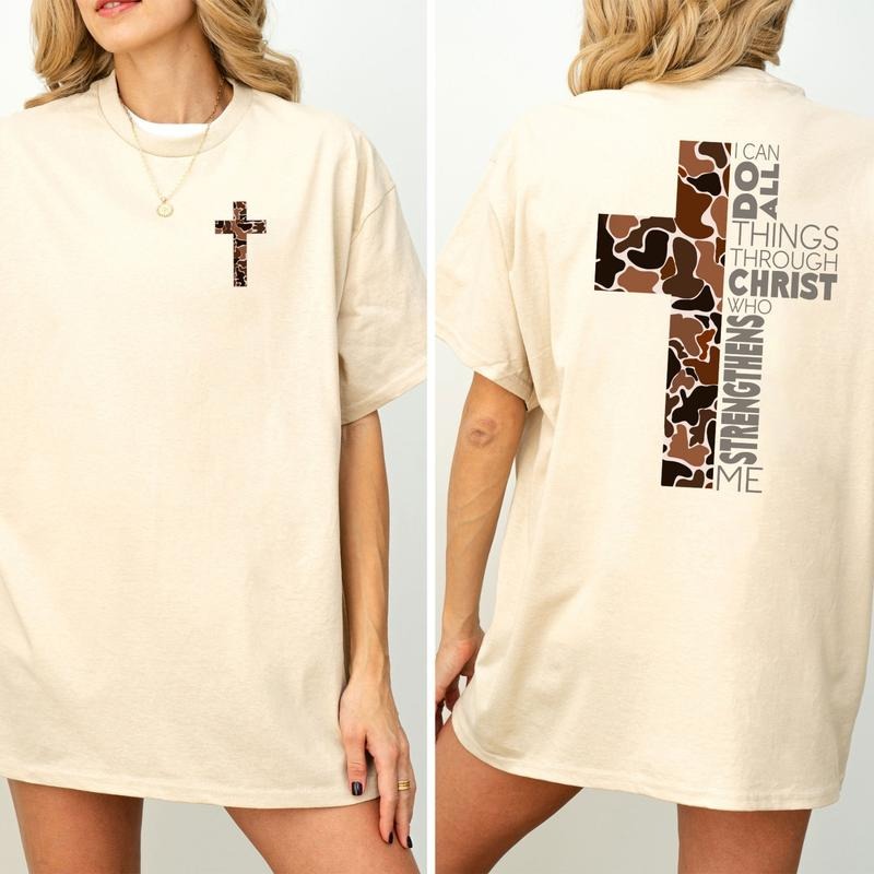 Christian Camo Cross T-Shirt, Philippians 4:13 Faith Tee, Religious Military-Inspired Apparel, Womenswear Ultra Soft Cotton Tee, Casual Everyday Graphic T-Shirt
