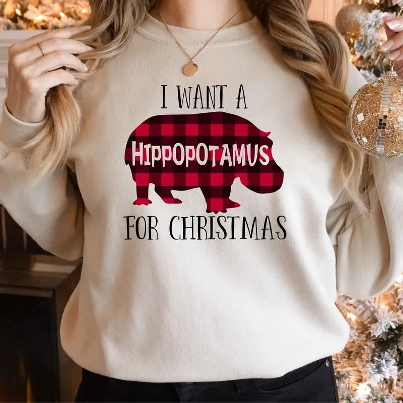 Christmas Hippopotamus Sweatshirt - Unisex Cotton Fabric, Classic Fit - Pullover Crewneck Womenswear