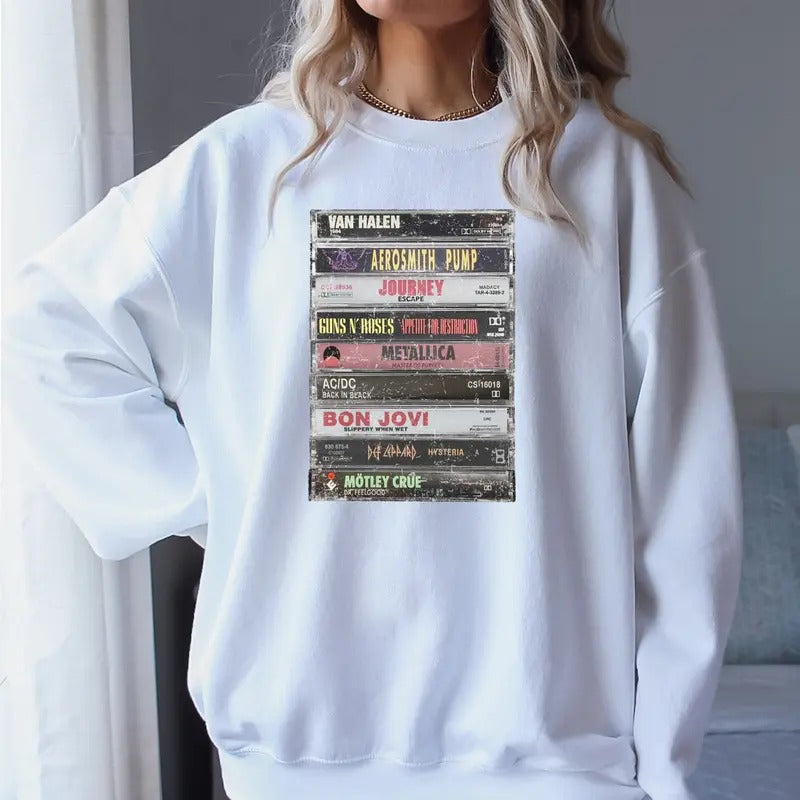 Classic 80s Rock Bands Hoodie. 1980s Music Cassette, List Of 80s Bands, Rock Fans Merch, Unisex Sweater Pullover Tee