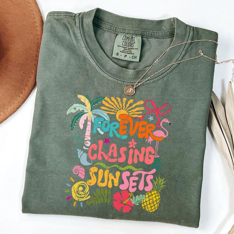 Comfort Colors Forever Chasing Sunsets T-Shirt, Retro Summer Shirt, Boho Floral Tee, Beach Shirt, Sunsets Shirt, Summer 2025 Tee, Unisex T-Shirt