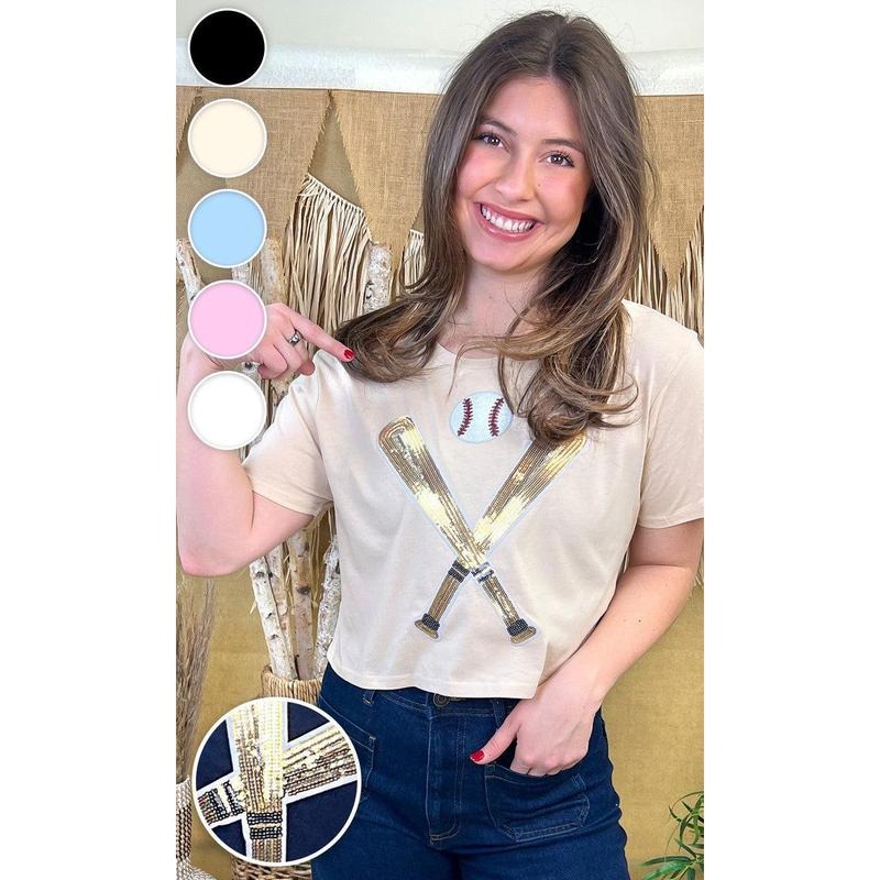 Crossed Bats Sequin Baseball Graphic Crop Top T-Shirt