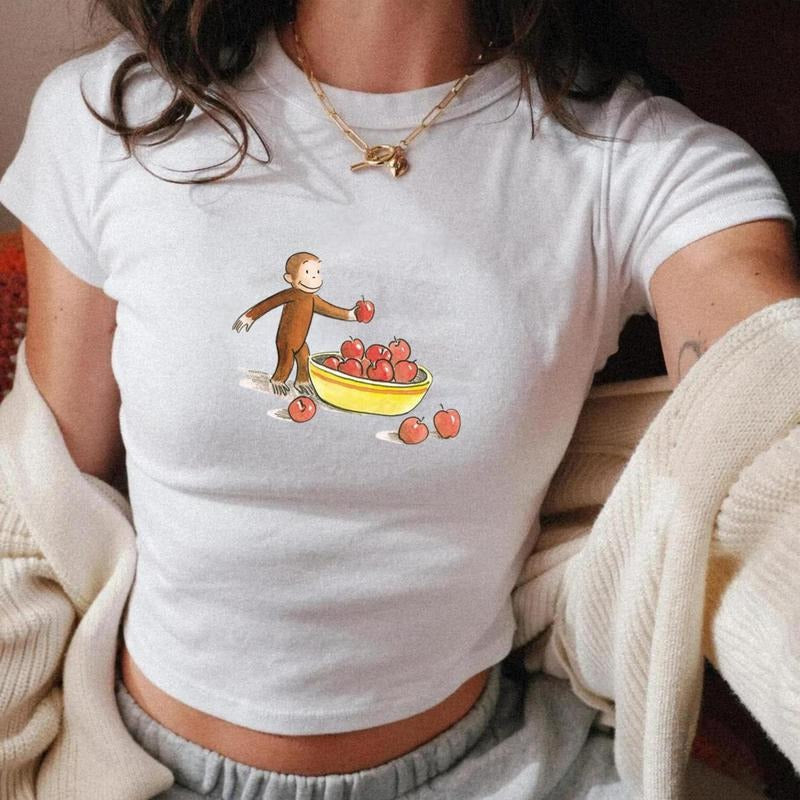 Curious George Apple Picking Baby Tee, Fall Harvest Graphic Tee, Y2k, 90s Clothing, Pinterest Aesthetic