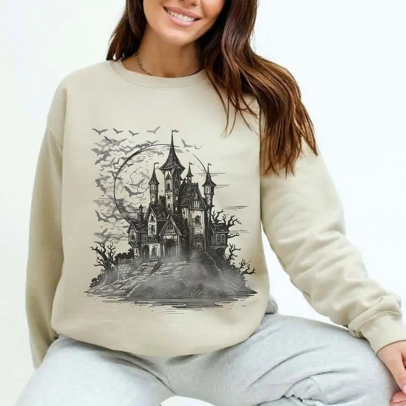 Dracula's Castle Sweatshirt, Transylvania Hoodie, Vampire Bat Shirt for Halloween, Gift for Scary Movie And Book Lovers, Classic Horror Womenswear Soft Crewneck Pullover Long Sleeves Graphic Fabric Sweater