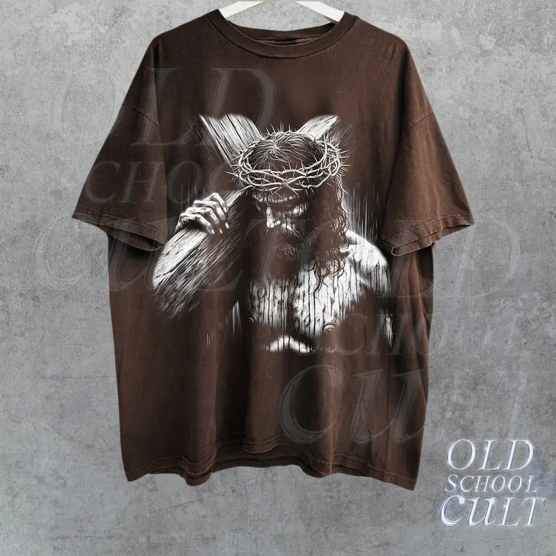 Jesus Holding Cross Vintage Halftone 90s Graphic Shirt, Retro Faith Jesus Shirt, Christian Shirt Cotton Menswear