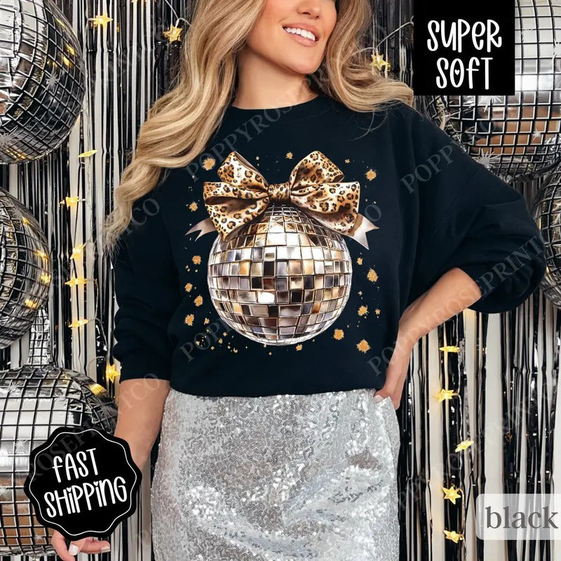 Leopard Disco Bow Sweatshirt, New Year's 2025 Crewneck, NYE Women's Sweater