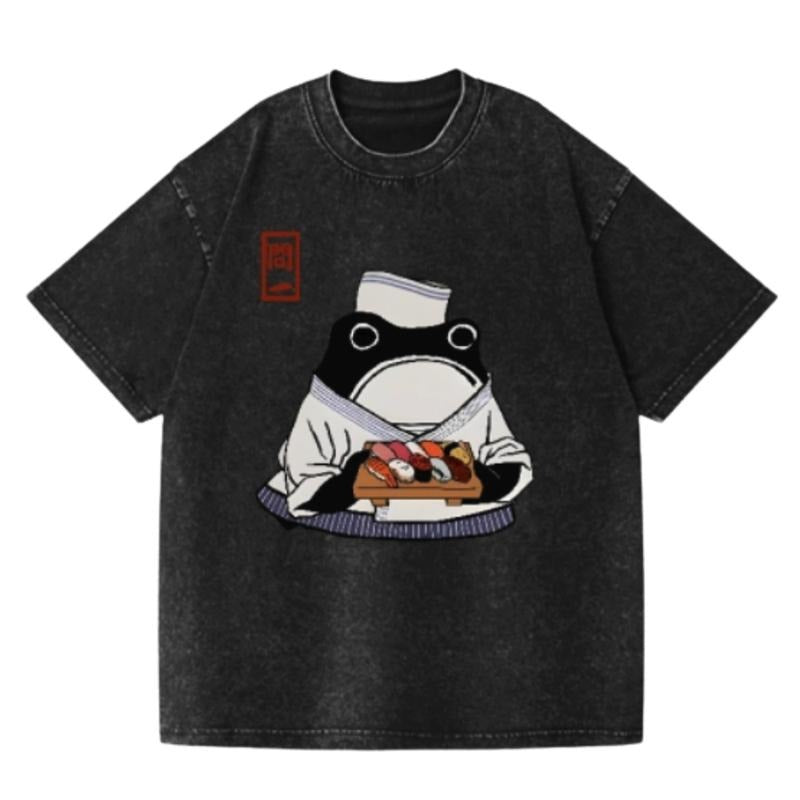 Matsumoto Hoji Sushi Frog Vintage Wash Japanese Design T-Shirt, Funny Anime Graphic Tee Shortsleeve Comfort Top