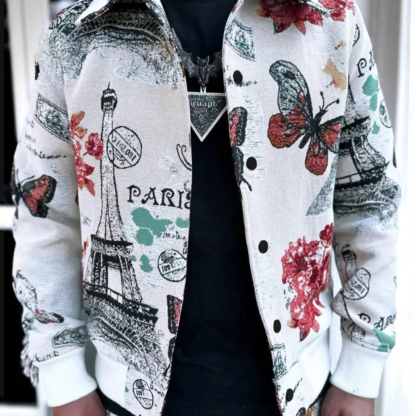 Men's Floral & Butterfly & Eiffel Tower Print Button Front Jacket, Street Fashion Long Sleeve Collared Outerwear for Daily Wear, Men's Clothes for Spring & Fall