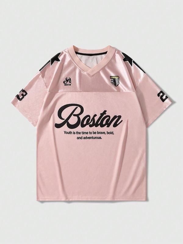 Men's Letter Graphic Drop Shoulder Jersey, Regular Fit Casual Short Sleeve V Neck T-Shirt for Summer, Fashion Men's Top for Daily Wear