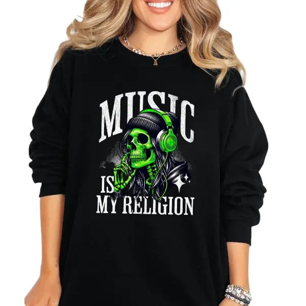 'Music Is My Religion' Crewneck Sweatshirt, T Shirt, or Hoodie Pullover | Punk, Alt, Grunge, Goth, Skeleton, Skull, Streetwear Style