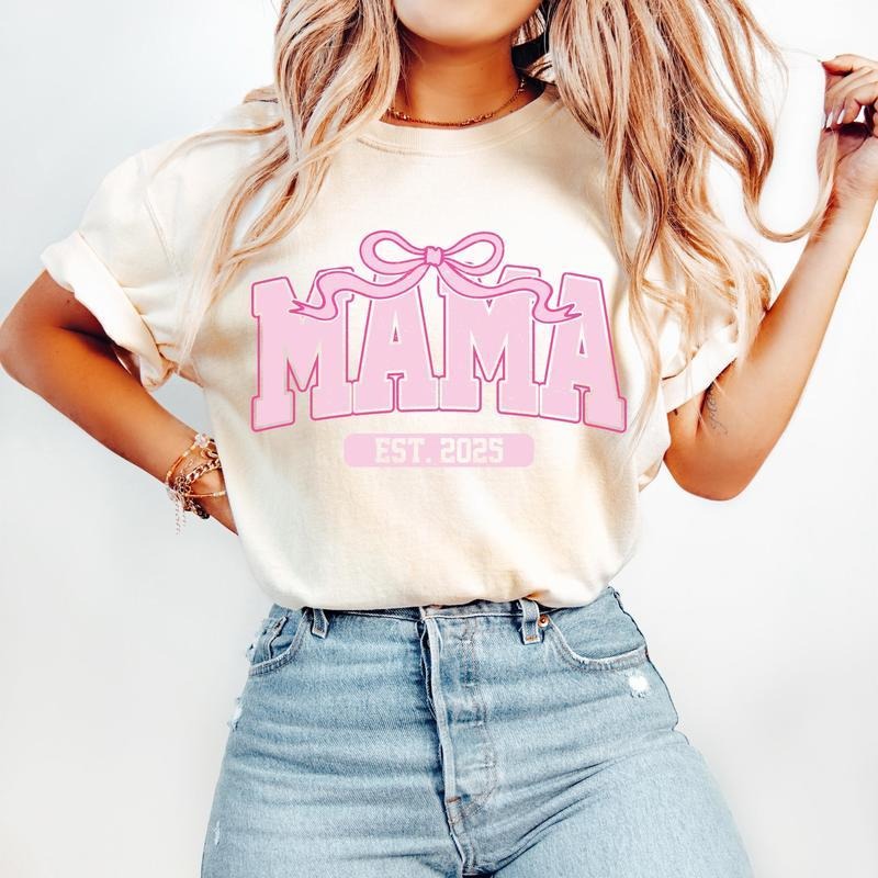 Pink Mama Est 2025 Coquette T-Shirt, Mama T-Shirt, Mothers Day T-Shirt, Mama Varsity T-Shirt, Gift for Mom, Mother, Mama Shirt New Mama T-Shirt, tshirt hot trend 2025