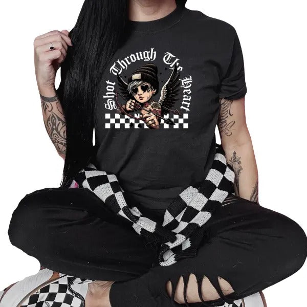 Shot Through the Heart Black Crewneck Sweatshirt, T Shirt, or Hoodie Pullover | Punk, Alt, Grunge, Goth, Skeleton Style, Valentine's Day Gift