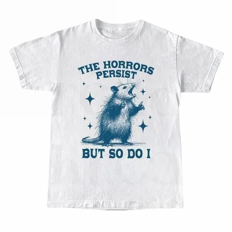 The Horrors Persist But So Do I Tshirt, Retro Opossum Shirt, Sarcastic T-Shirt, Funny Mental Health, Meme Tee, Funny Raccon Tee Top Streetwear