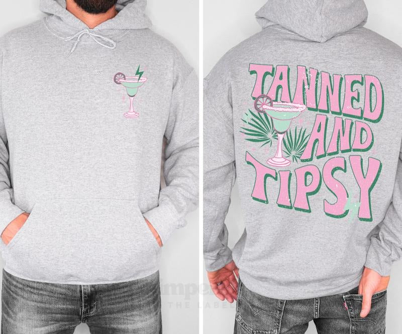 Tipsy and Tanned Hoodie, Summer Vibes Apparel, Trendy Graphic Hoodie for Beach Lovers, Casual Sweatshirt for Vacation Style, Fun & Playful Fashion, Cozy & Stylish Hoodie for Men & Women Fabric Menswear