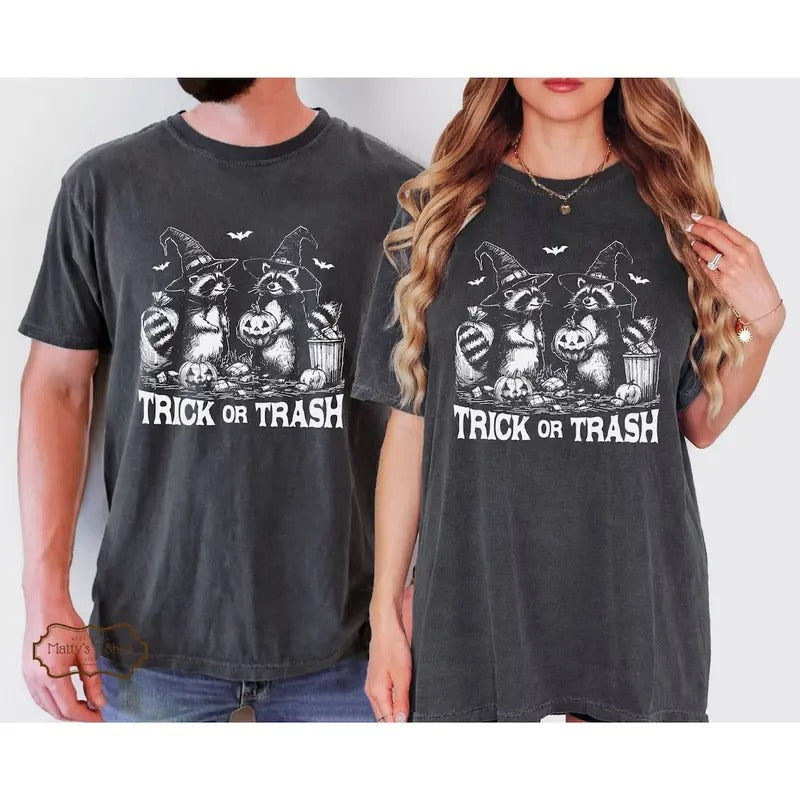 Trick or Trash Raccoon T-Shirt - Funny Halloween Graphic Tee - Cute Witch Raccoons Shirt Cotton Menswear Polyester Top