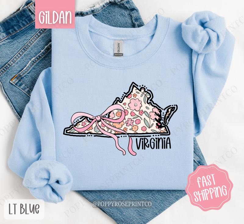Virginia Floral Bow Gildan Sweatshirt, Cute Trendy State Coquette Pullover