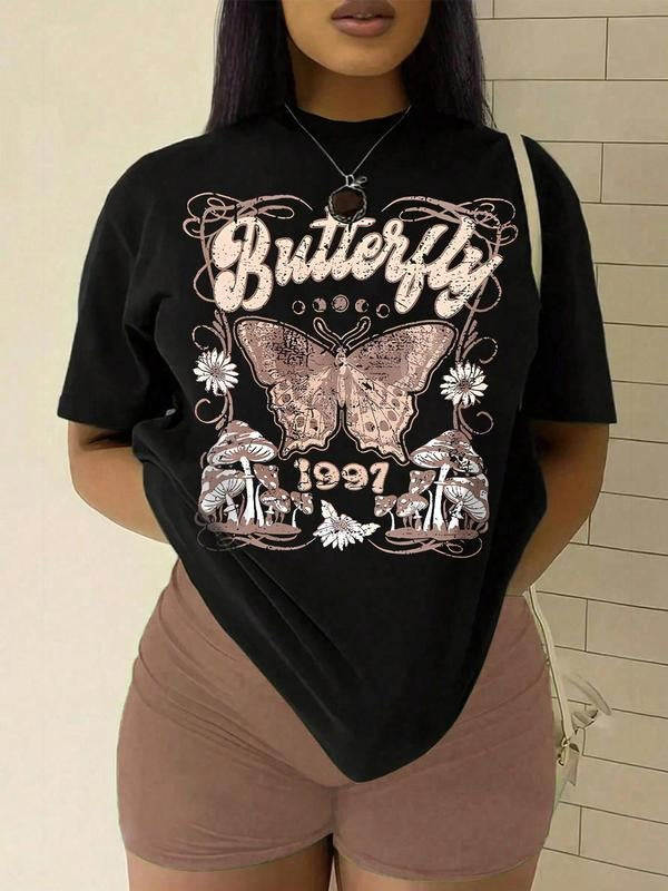 Women's Butterfly & Letter Print Round Neck Graphic Tee, Vintage Trendy Casual Short Sleeve T-shirt For Daily Wear, Ladies Summer Outfit