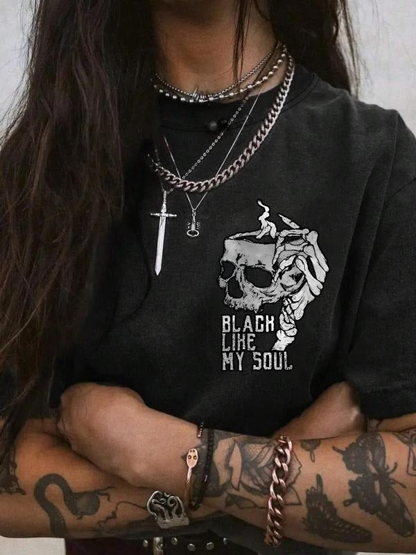 Women's Skull & Letter Print Round Neck Graphic Tee, Vintage Trendy Casual Short Sleeve T-shirt for Daily Wear, Ladies All Seasons Outfit