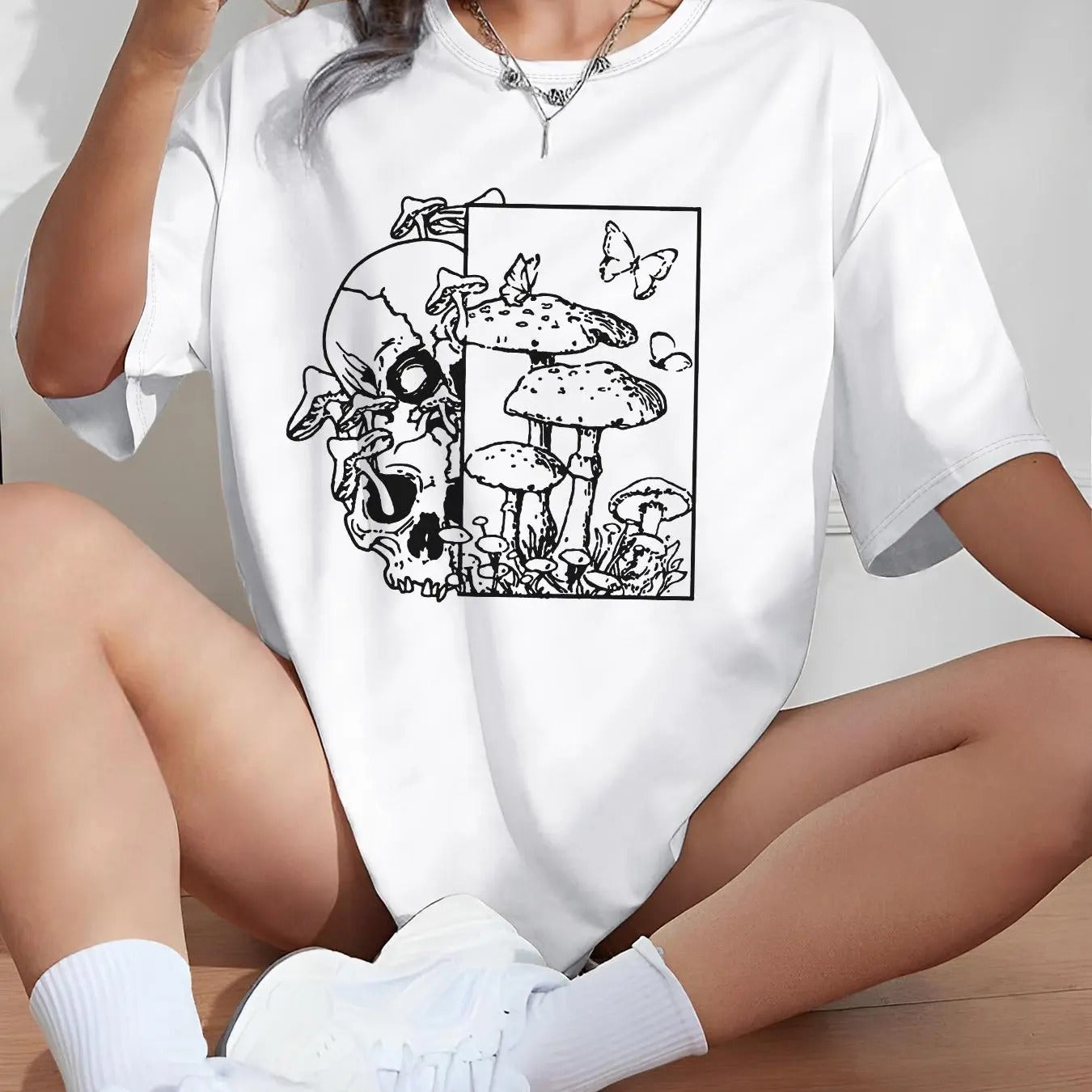 Women's Skull & Mushroom Print Round Neck Graphic Tee, Vintage Trendy Casual Drop Shoulder Half Sleeve T-shirt For Daily Wear, Ladies All Seasons Outfit